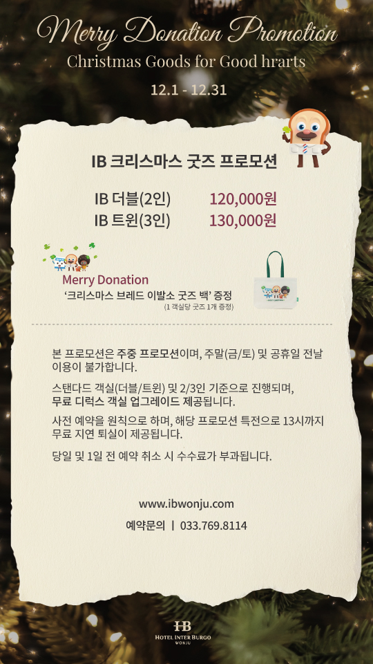 패키지 <12월 크리스마스 굿즈 프로모션> Marry Donation Promotion 관리자 기간2025.11.27 ~ 2025.12.31 조회수25 목록으로 이전글 <8-9월 생일 프로모션> Happy Birthday Stay 다음글 <12월 윈터 시즌 프로모션> Winter Vacation