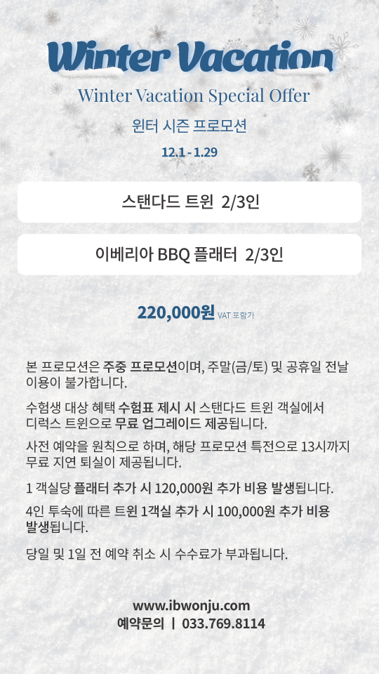패키지 <12월 윈터 시즌 프로모션> Winter Vacation 관리자 기간2025.11.27 ~ 2026.01.29 조회수69 목록으로 이전글 <12월 크리스마스 굿즈 프로모션> Marry Donation Promotion 다음글 <12월 골프 객실 프로모션> Swing ALL DAY, Relax ALL NIGHT