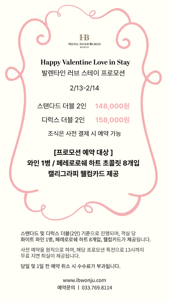 패키지 <객실 프로모션> 발렌타인 러브 인 스테이 관리자 기간2026.02.06 ~ 2026.02.14 조회수12 목록으로 이전글 <졸업입학 프로모션> Happy New Start 다음글 <객실/웰니스 프로모션> 설 명절 가족 대상 프로모션