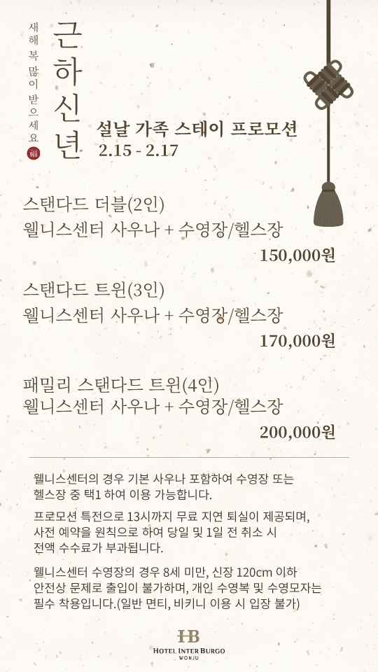 패키지 <객실/웰니스 프로모션> 설 명절 가족 대상 프로모션 관리자 기간2026.02.06 ~ 2026.02.17 조회수14 목록으로 이전글 <객실 프로모션> 발렌타인 러브 인 스테이 다음글 다음글이 없습니다.