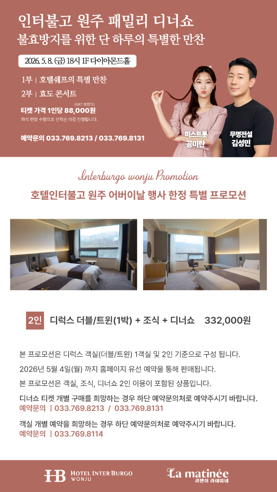 패키지 <어버이날 디너쇼 연계 프로모션> 인터불고 원주 패밀리 디너쇼 관리자 기간2026.04.15 ~ 2026.05.04 조회수46 목록으로 이전글 <4월 객실·조식 프로모션> STAY, SIP, SPRING 다음글 다음글이 없습니다.